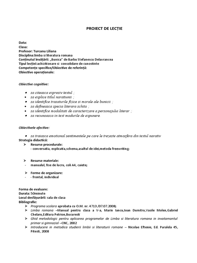 Proiect De Lectie Clasa Av A Bunica De B St Delavrancea