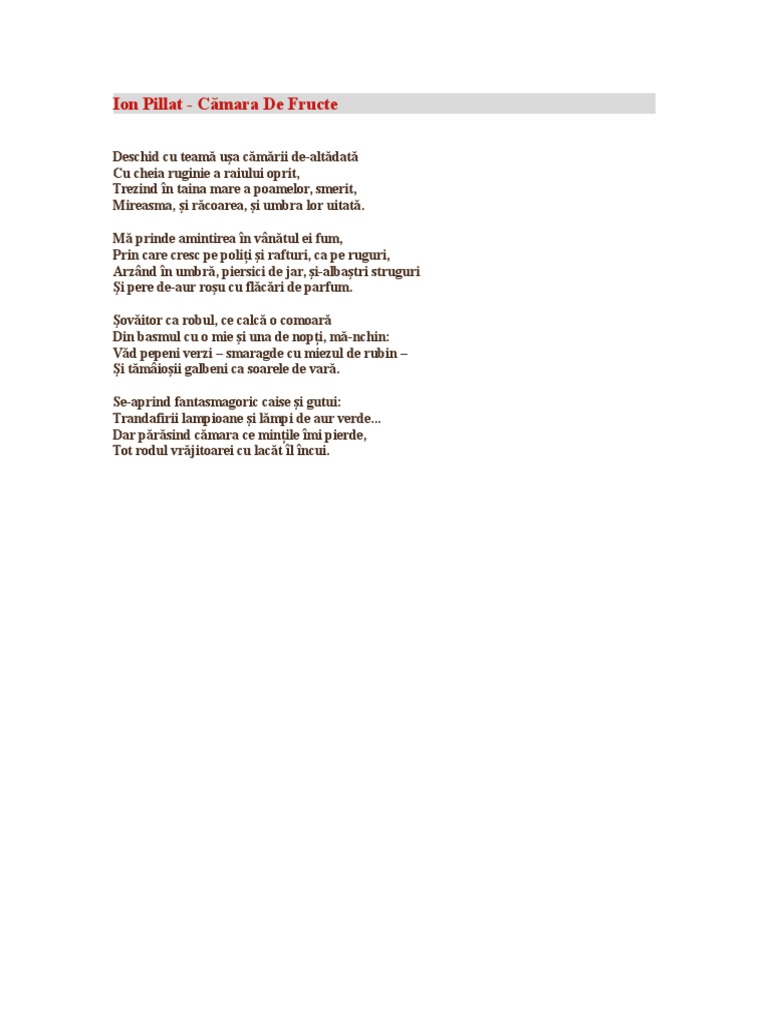 Argumentare Operă Lirică La Poezia Cămara De Fructe De Ion Pillat Limba Romană