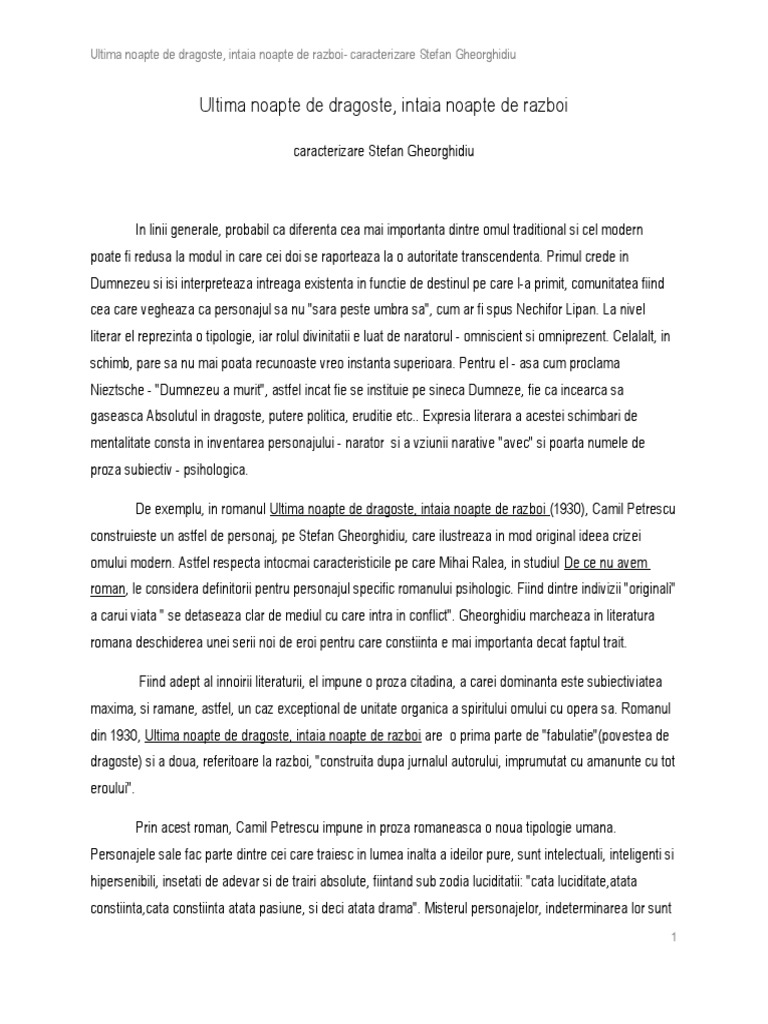Doc Caracterizare Stefan Gheorghidiu Ultima Noapte De Dragoste Intaia Noapte De Razboi De Camil Petrescu Elena Grigorescu Academia Edu