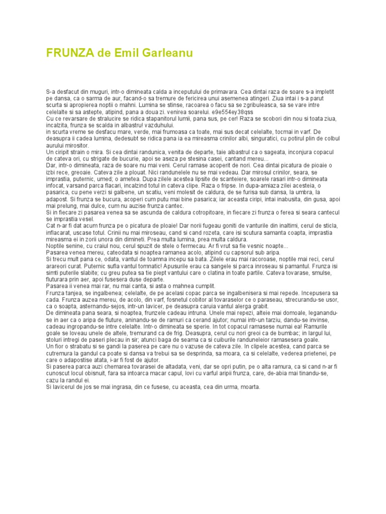 Frunza de emil gârleanu s a desfăcut din mugur într o dimineaţă caldă a începutului de primăvară. Ziua intai i s a parut scurta si apropierea noptii o mahni. Celelalte de pe acelaşi copac parca se îngalbenisera şi mai repede. Cea dintâi rază de soare s a împletit pe dânsa ca o sârmă de aur făcând o să tremure de fericirea unei asemenea atingeri.
