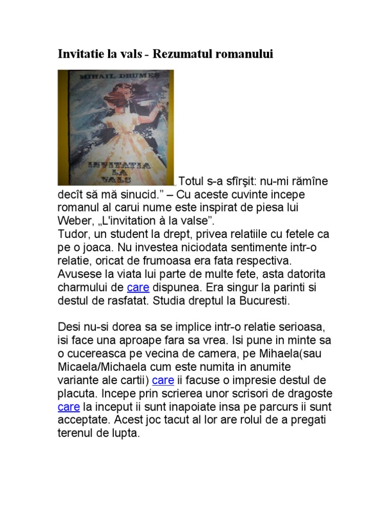 Rezumat invitatie la vals. Chiar și în ziua de azi acesta este unul dintre cele mai iubite titluri ale literaturii române interbelice. Surprinde frumuseţea tumultoasă a tinereţii dorinţa nestăvilită de a experimenta senzaţii noi idealismul iubirilor ce par veşnice şi dramatismul unor decizii radicale influenţate de stările intense de moment care au însă consecinţe ireversibile. Nu mi rămîne decît să mă sinucid cu aceste cuvinte incepe romanul al carui nume este inspirat de piesa lui weber l invitation à la valse. într un interviu scriitorul mărturiseşte că s a inspirat dintr un fapt real.